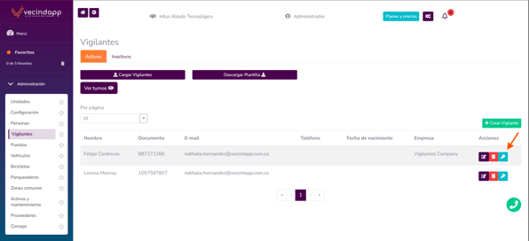 Allà encontrarás el listado de todos los vigilantes creados en la copropiedad.